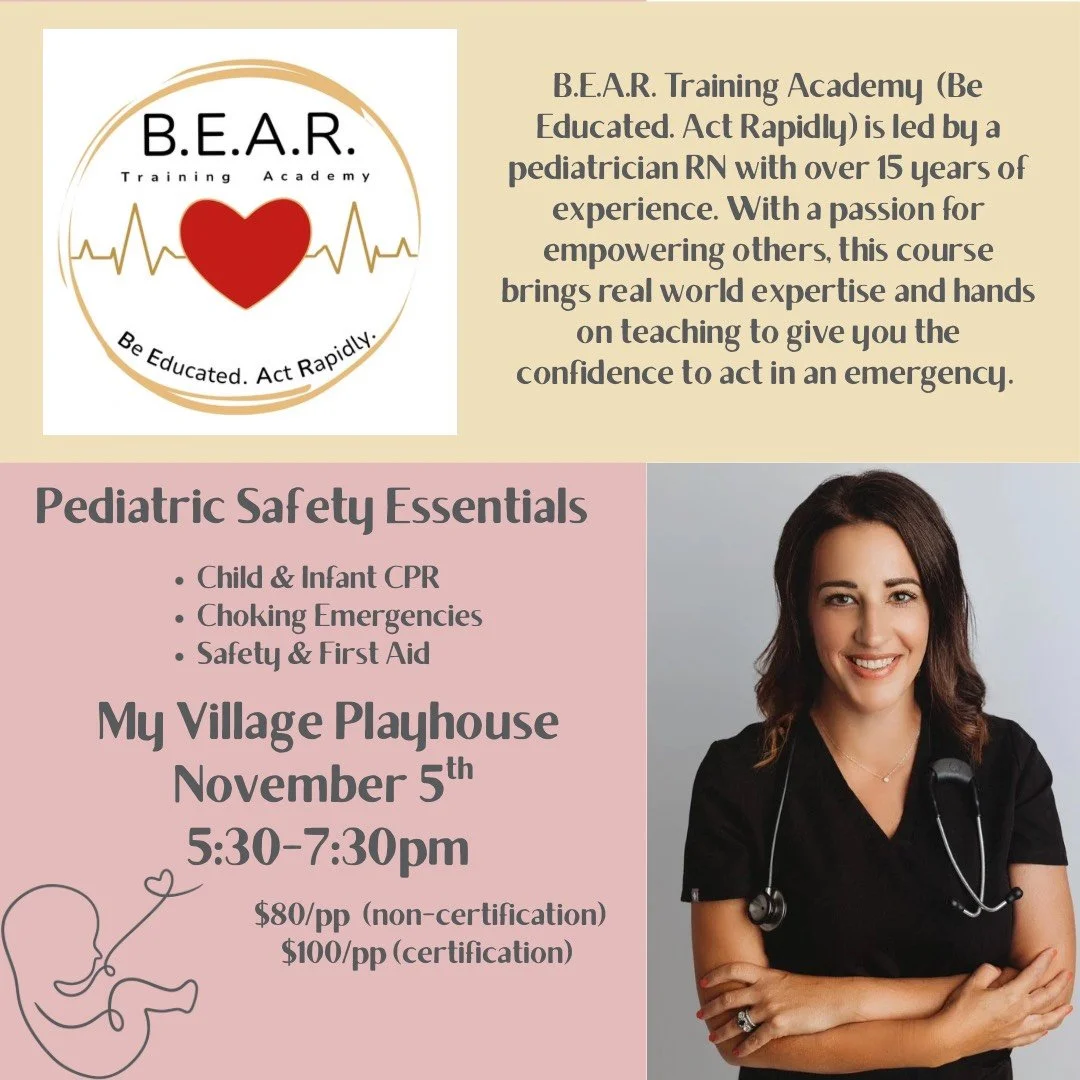 We’re so excited to team up with B.E.A.R. Training Academy (Be Educated. Act Rapidly.) for a hands-on CPR at My Village Playhouse.